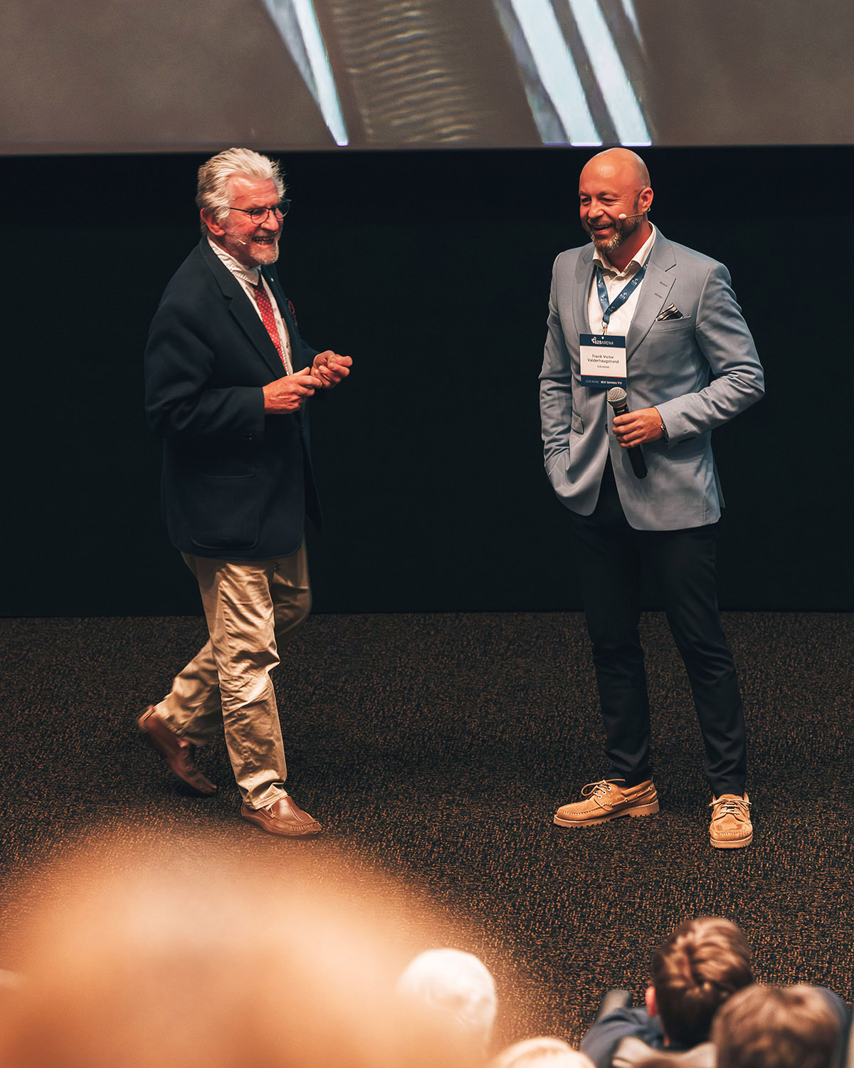 PRIVILIGERT: Medlemmene i B2B ARENA har besøk av store kapasiteter og personligheter flere ganger hvert eneste år. Her er gründer Frank Victor Valderhaugstrand på scenen sammen TV-legenden Hans-Wilhelm Steinfeld. Foto: Geir Bjørndal Srisoi